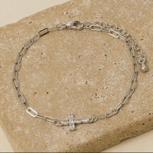 Dainty Chain Link Cross Bracelet - Silver
