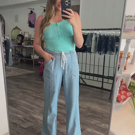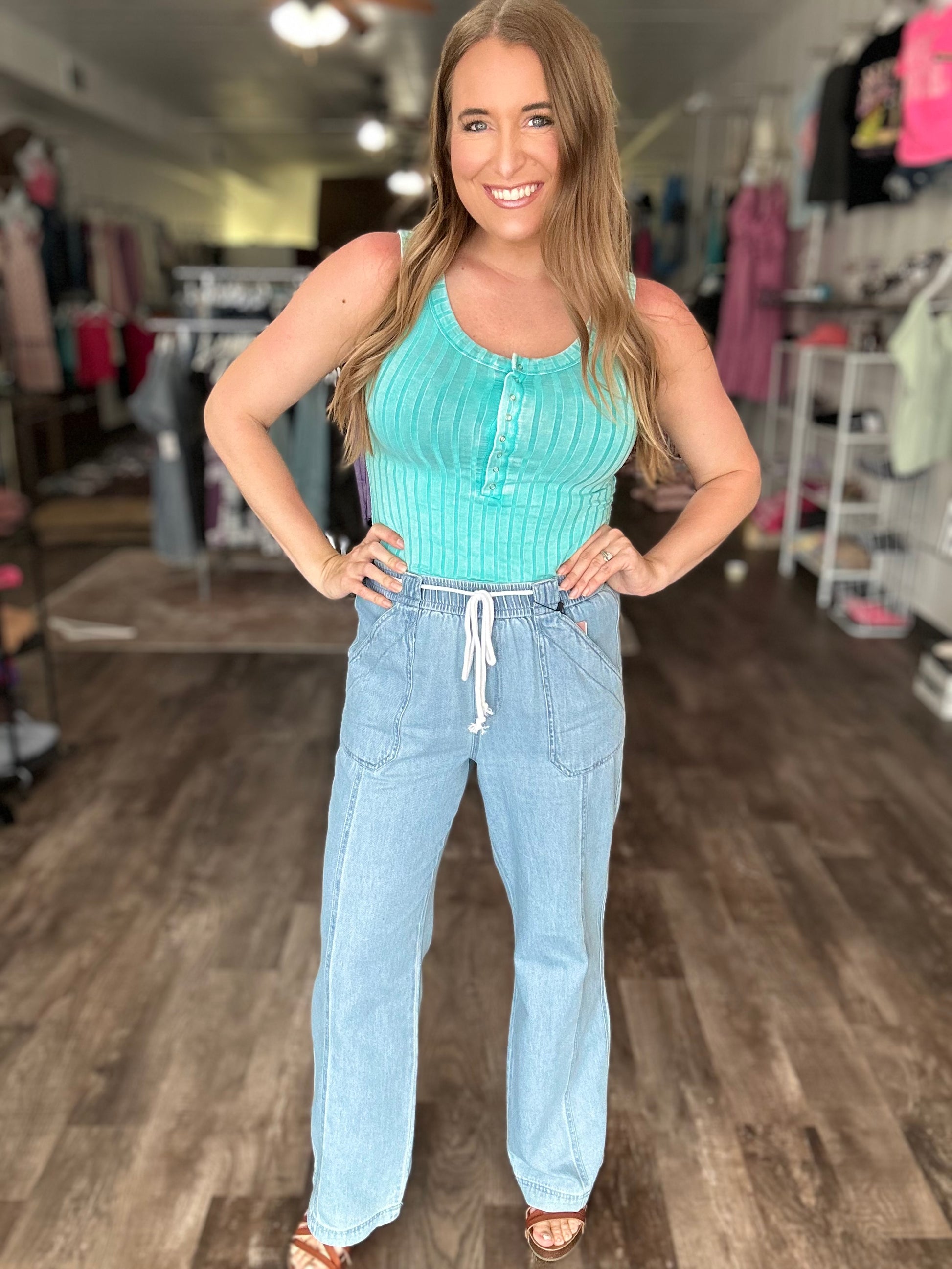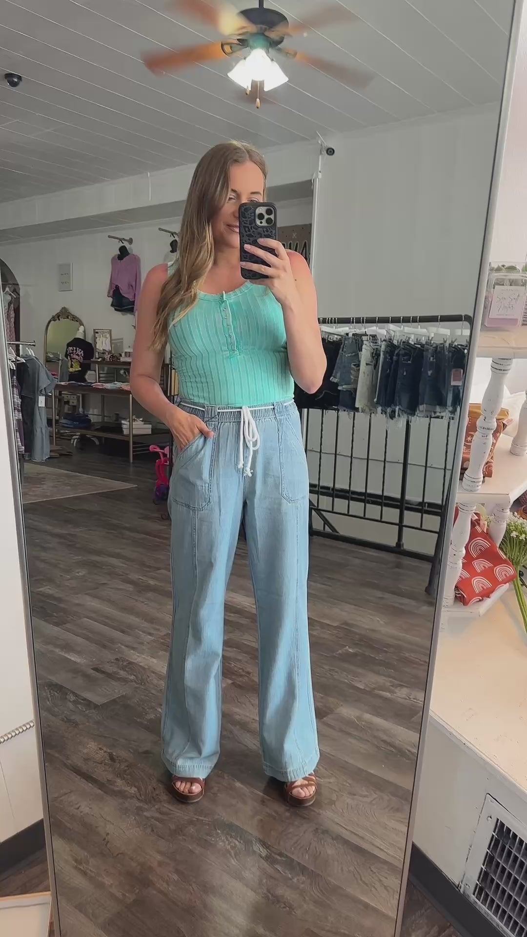 True to size. Ashley is wearing size medium, her usual size. She typically wears size 7 in numerical sizing denim.