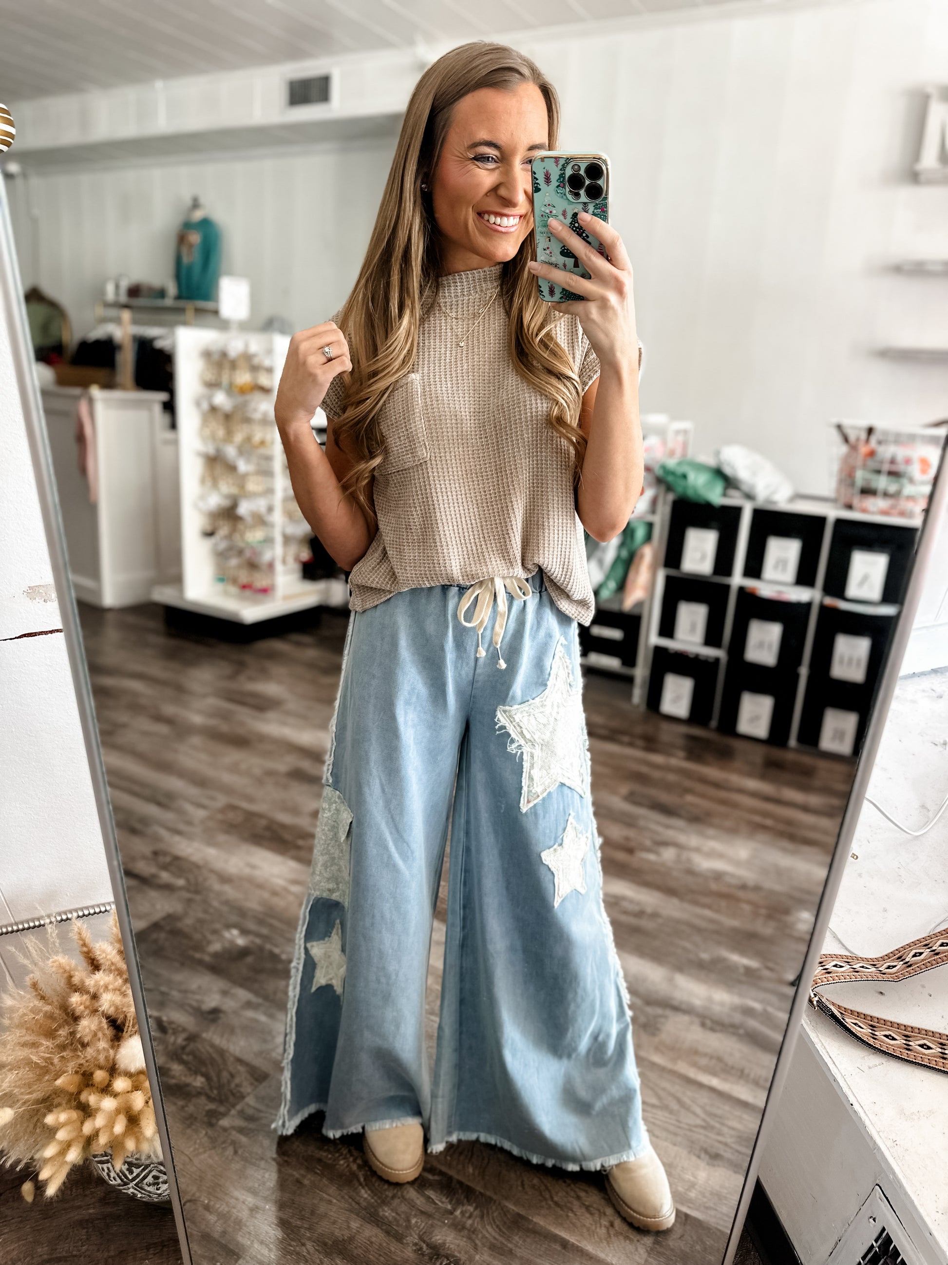 Fit: True to size. Adjustable drawstring and stretchy waist. Ashley is wearing size small, her usual denim size is 3. She is 5’7”, 140lbs.