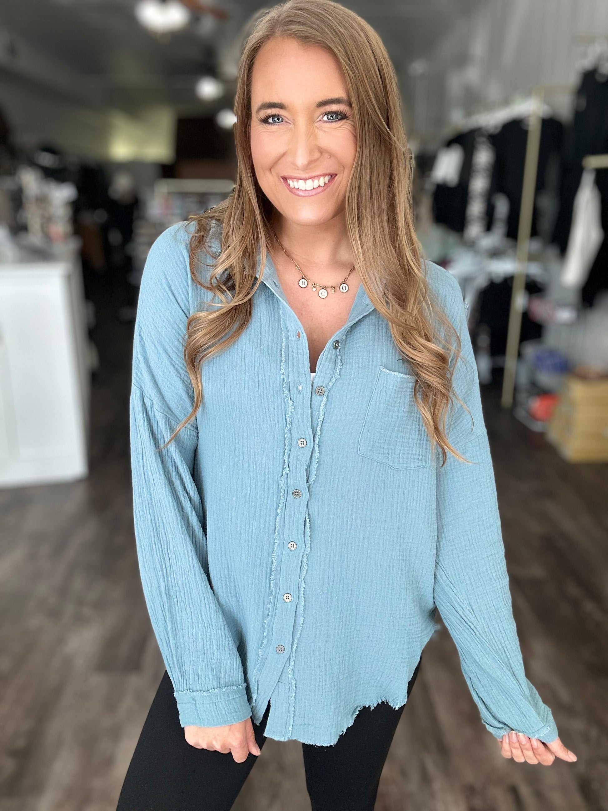 Out of Range Gauze Knit Button Down - Blue Grey