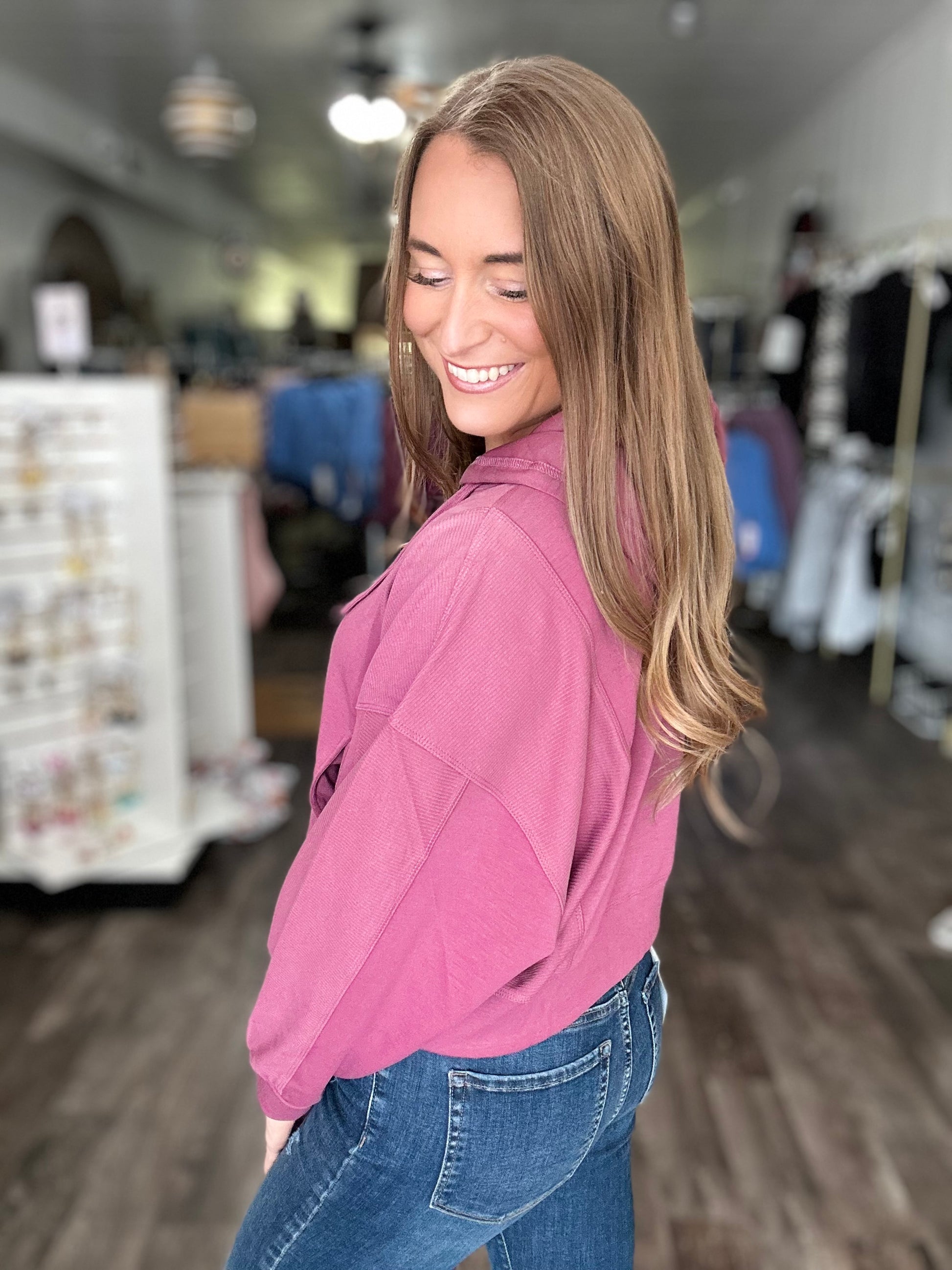 Fit: True to size though Ashley sized up for more room in the arms. She is wearing size medium, typically she is a small. She is 5’7”, 140lbs, 36D bust.